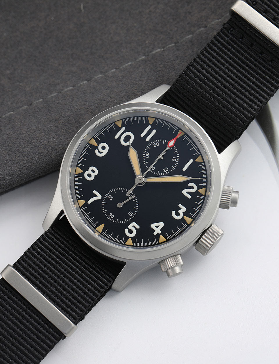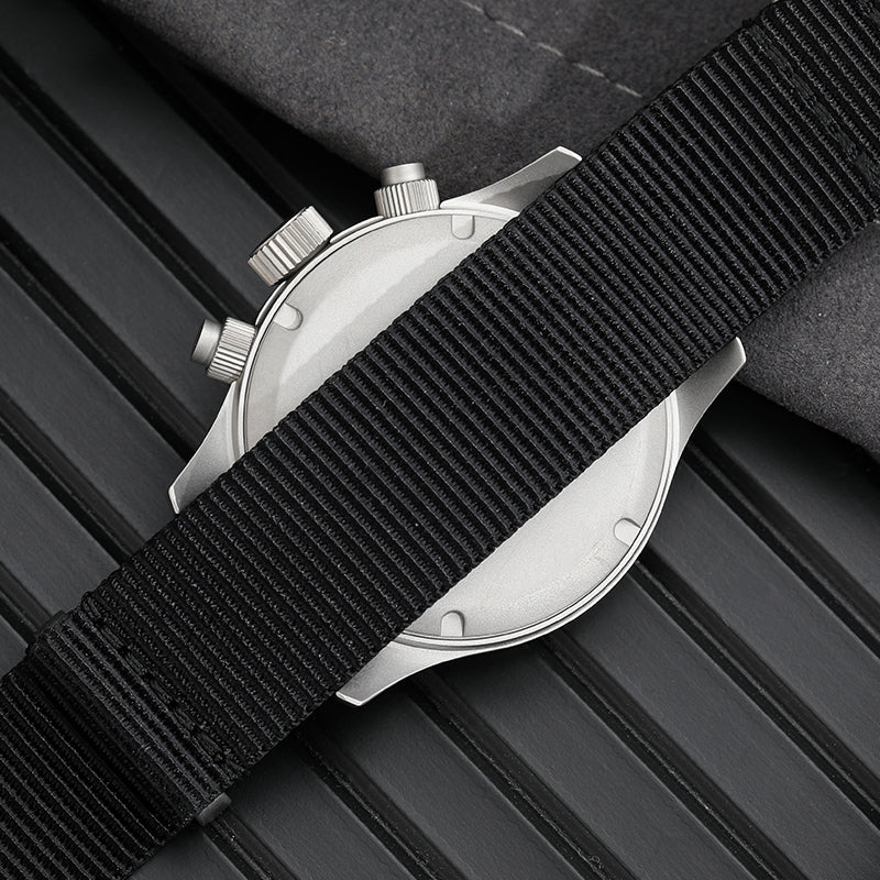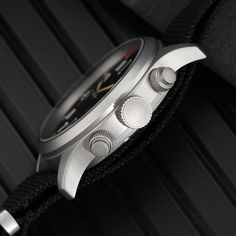 The Militado ML1868 combines vintage aesthetics with modern precision engineering. Powered by the VK61 quartz chronograph movement, this timepiece delivers reliable performance with a subsecond dial and 60-minute chronograph function. The robust 39mm case is crafted from 316L stainless steel with a bead-blasted finish, complemented by a screw-down case back and screw-in crown for enhanced durability. Sapphire crystal with anti-reflective coating ensures excellent legibility, while Swiss Super-Luminous two-tone lume (BGW9+Retro) guarantees visibility in low-light conditions. Water-resistant to 100m, this chronograph is built for everyday wear and adventure. At 12.3mm thick with a 46.5mm lug-to-lug length, it strikes an ideal balance between presence and wearability.